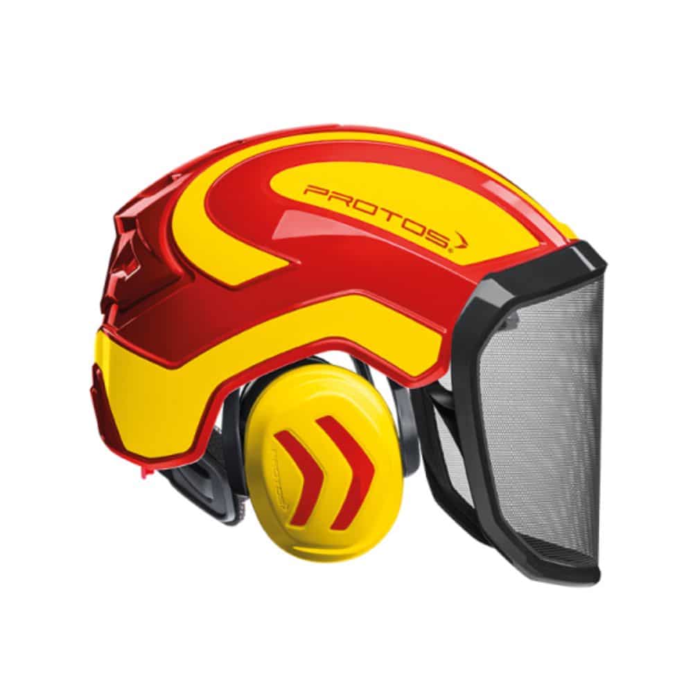 Le casque est proposé en taille unique (54 à 62 cm) et en coloris jaune et rouge. À noter qu’un casque doit être impérativement remplacé après un choc et que sa durée de vie maximale est de 5 ans. Ce modèle n’est pas équipé de mentonnière et n’est donc pas adapté aux travaux en hauteur. Pour ce type d’utilisation, seules les versions Protos® Integral CLIMBER ou ARBORIST, dotées d’une jugulaire et d’un crashabsorber, sont recommandées.