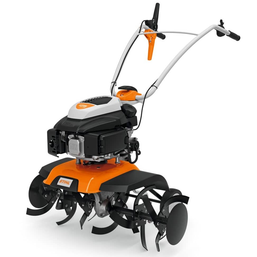 - Réglage centralisé du guidon : le levier à tendeur rapide permet d’adapter le guidon sur le côté et en hauteur et de le replier, pour permettre le travail le long d’un mur ainsi que le transport ou le stockage de la motobineuse.