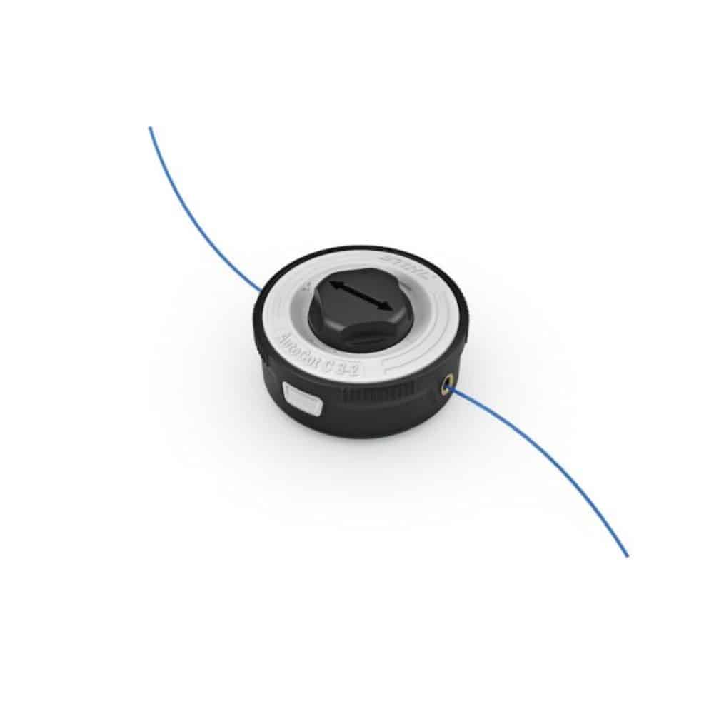 Tête Faucheuse à double fil, pour les travaux de nettoyage et de fauchage. Le fil de coupe est automatiquement ajusté par frappe de la tête de coupe au sol. Le rechargement du fil peut se faire de l’extérieur sans ouvrir le boîtier. Cette tête se monte sans outil grâce au pas de visse (orange) présent sur les machines compatibles.